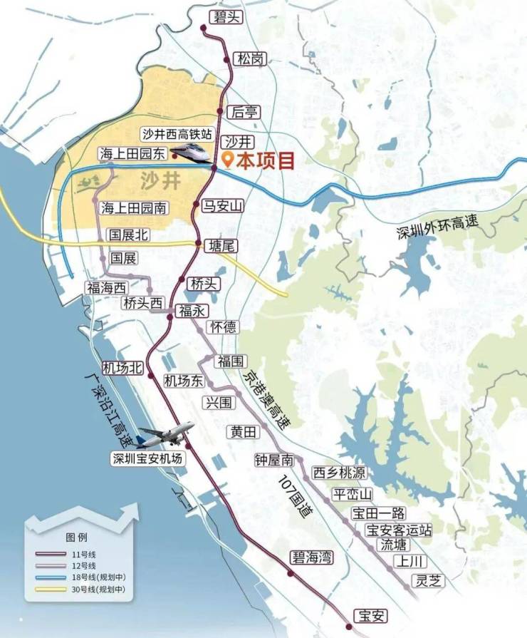 11号线是深圳首条快线地铁,通勤效率极高——6站达机场,8站达宝中,15站即可直抵科技园。未来还将叠加18号线与20号线,实现多维换乘。