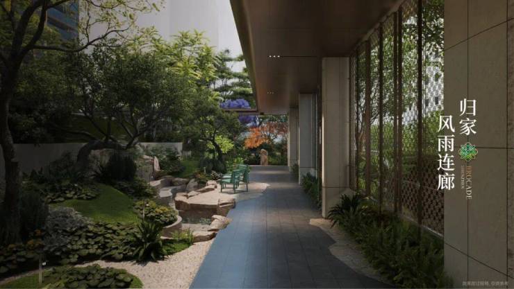 风雨连廊的链接,如一条串联绿城生活的珍珠项链,在“流光溢彩”的氛围中,将绿植水景、休憩平台一一相连,塑造移步异景的立体生态廊道。