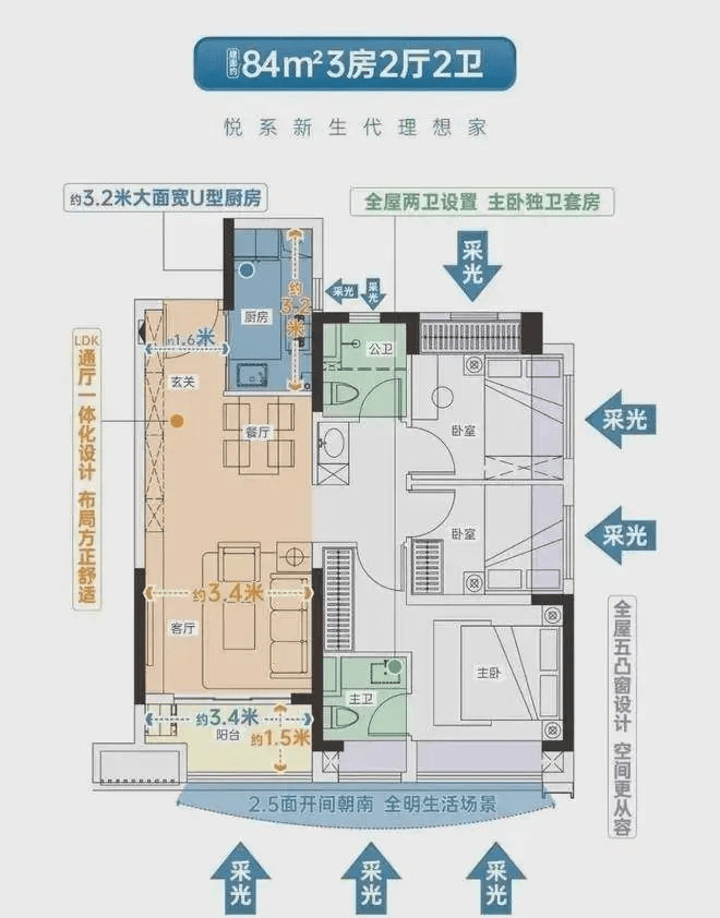 84㎡的3房2厅2卫:传统竖厅动静分区格局,客厅进深7.55米(不含阳台),开间3.4米,主卧8.4㎡(不含主卫和飘窗),空间确实会偏紧凑一点,但没什么硬伤,实用性还是非常不错的。