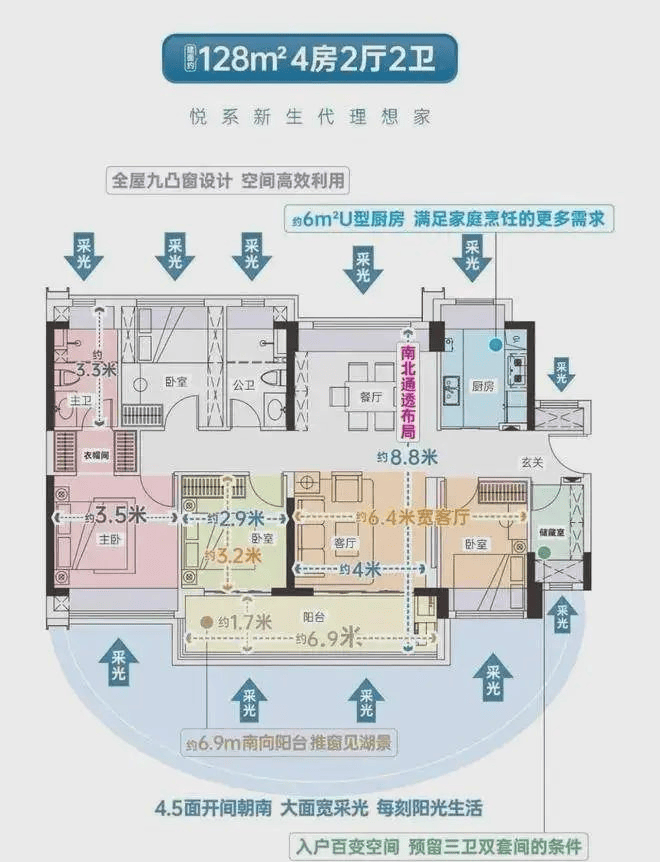 128㎡的4房2厅2卫:属于南北通透竖厅格局,客厅进深7.1米(不含阳台),开间4米,配有6.96米宽景阳台,主卧套间设计,配有衣帽间和三段式卫生间。这个户型除通透性比传统横厅更优异外,静区部分的静溢性也会比较好,居住舒适性更佳,受众也是老少皆宜。