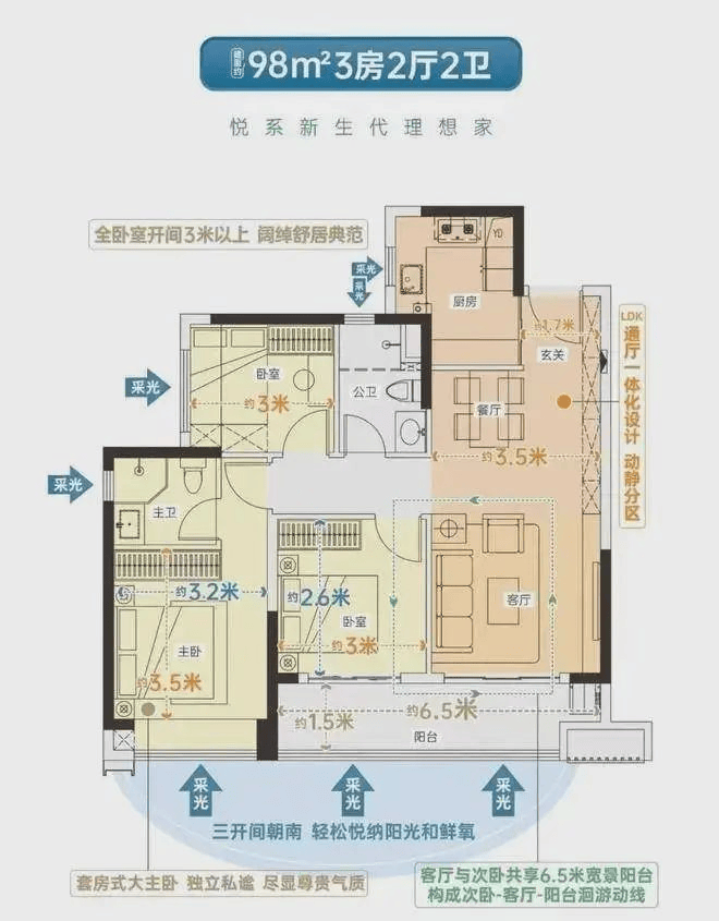 98㎡的3房2厅2卫:传统竖厅动静分区格局,客厅进深7.55米(不含阳台),开间3.5米,配有6.5米宽景阳台,主卧13.18㎡(不含主卫和飘窗),客厅空间变化不大,但厨房和卧室空间要好很多,居住的舒适性会比较好。