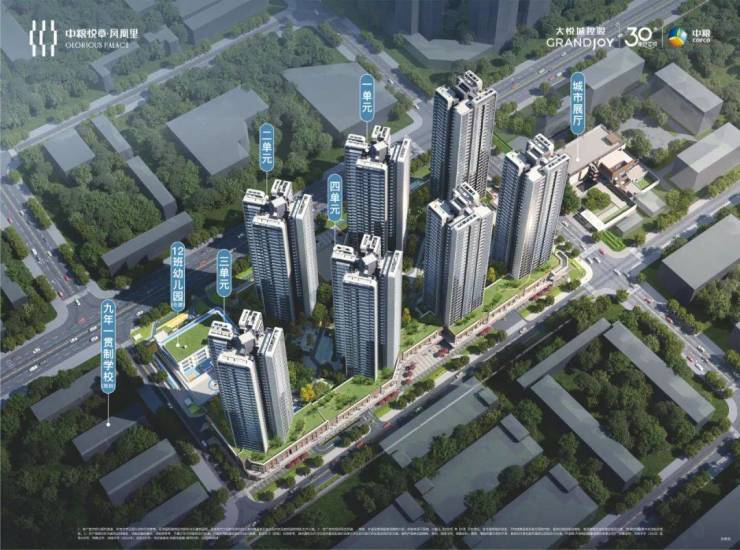中粮悦章凤凰里,总占地面积约3.26万㎡,总建筑面积约21.21万㎡,计容建筑面积约16.25万㎡,容积率4.62,绿化率30%,共