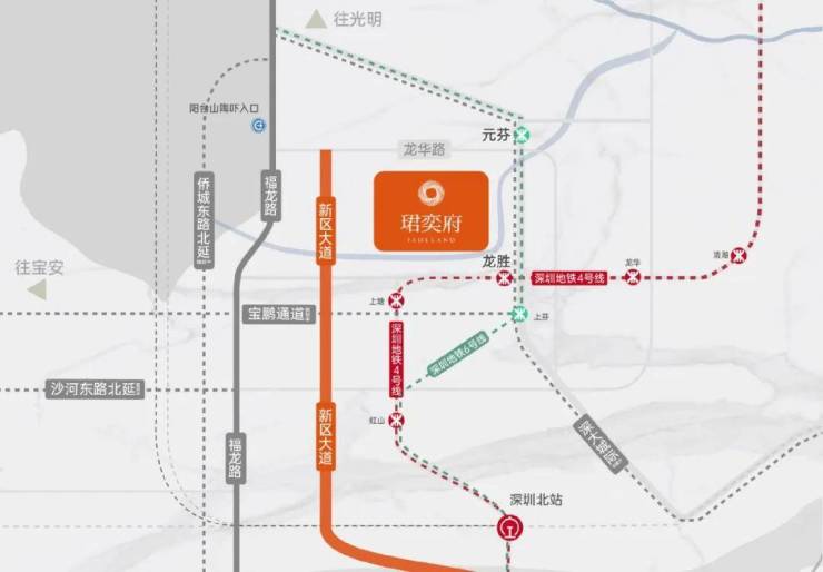 地铁:4号线龙胜站(约500米)、6号线元芬站(约800米),3站直达深圳北,5站速抵福田;城际:深大城际(在建中),3站直达机场;路网:新区大道、福龙快速路等主干道,串联福田、南山、宝安,通勤效率提升约20%。