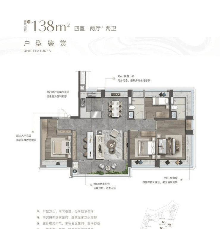 横厅南北通透格局,客餐厅6米开间,全屋飘窗,4个卧室分别做到了3.9米/3米/2.8米/2.6米的宽度,L型厨房,得房率约95-97%(包含赠送),东南或西南朝向以及西北朝向,有3种户型格局,但整体差异并不大,都是横厅设计,阳台同样非常宽敞。主要核心区别是阳台的设计,这应该是为了贴合楼栋朝向、景观所做的调整。