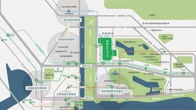 绿景白石洲位于深圳核心位置南山区的华侨城片区,深圳城市发展主轴——深南大道与大沙河创新走廊十字交汇点,依托华侨城人文艺术城区,链接后海总部基地、深圳湾超级总部基地、留仙洞总部基地、高新园总部基地四大总部基地。