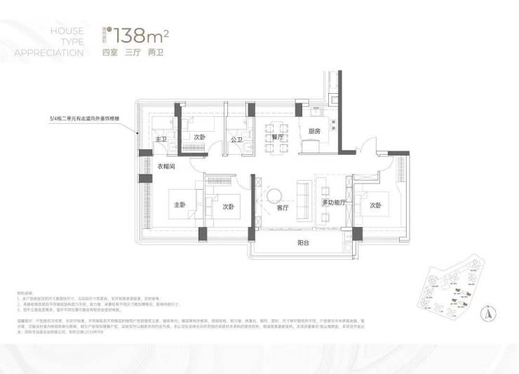 竖庭格局,西南向,基本居住功能与建面约108-110㎡4房2卫一致,但格局不一样,从目前公布的户型图上看,主要是主卧空间有了更大的提升,比如可以放更大一点的衣柜。但从位置上看,它所在的楼栋更靠近主干道,会有噪音影响。