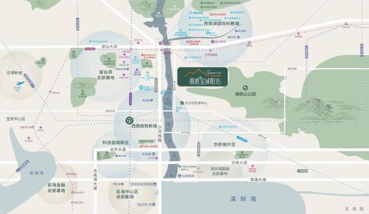 鼎胜金域阳光家园坐落于西丽中心区,具体位于珠光北路与留仙大道交汇处的南面,大致在大沙河流域中北段的东侧,背靠塘朗山,并被半包围着。