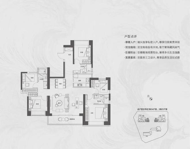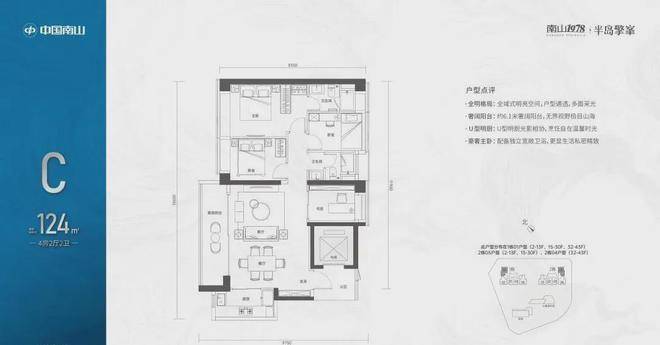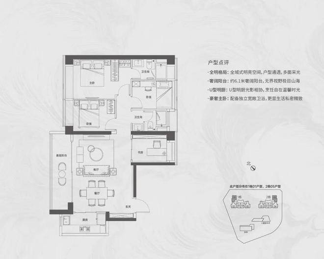 【124㎡的4房2厅2卫】1栋01/2栋05户型,电梯入户送独立公区,横厅南北通透格局,客餐厅6.1米开间,五开间朝南,主卧大套间设计,6.1米长观景大阳台,U型厨房,得房率:72.07%(不含赠送)西北或东南朝向;