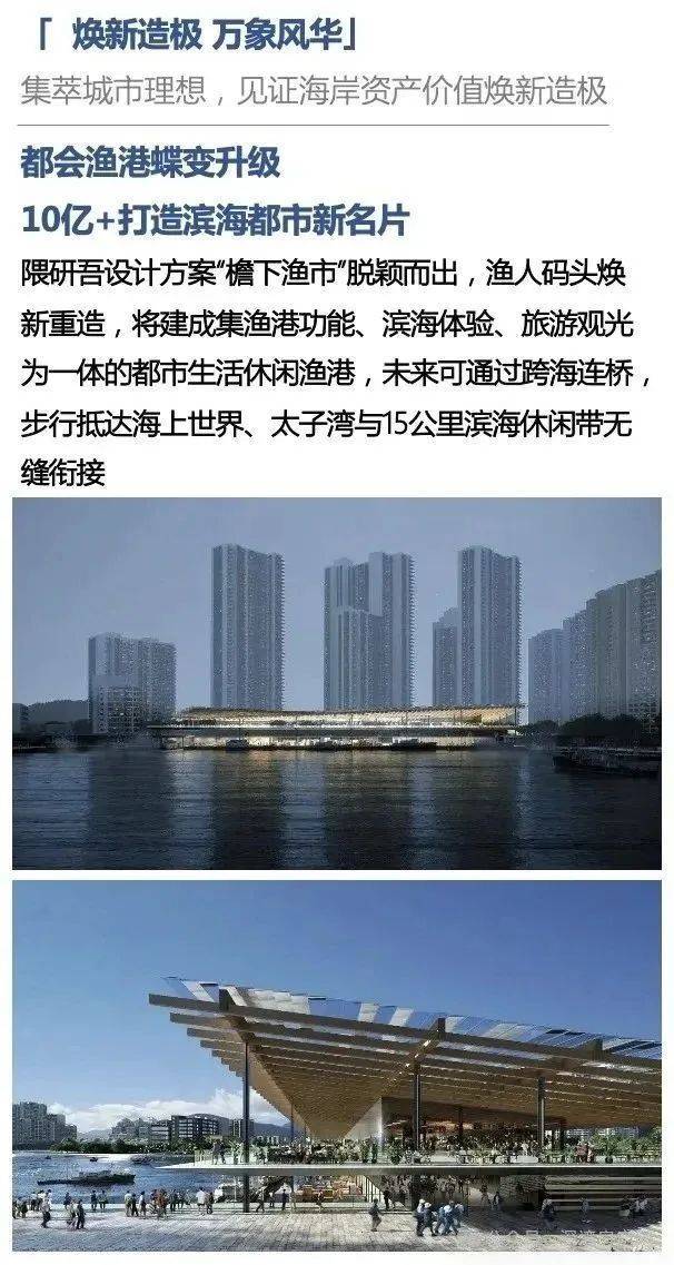 渔人码头升级:蛇口渔港升级改造工程今年10月已经开始招标设计方案,功能由单一的生产交易上升为集渔港功能、滨海体验、旅游观光为一体的都市生活休闲渔港。