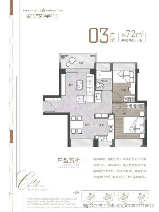 72㎡ 2房2厅1卫:适合小家庭或单身贵族居住,空间布局合理,满足基本生活需求。