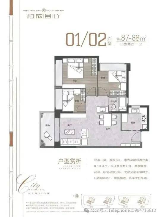 87-88㎡ 3房2厅1卫:三房设计,满足三口之家或四口之家的居住需求,空间宽敞舒适。