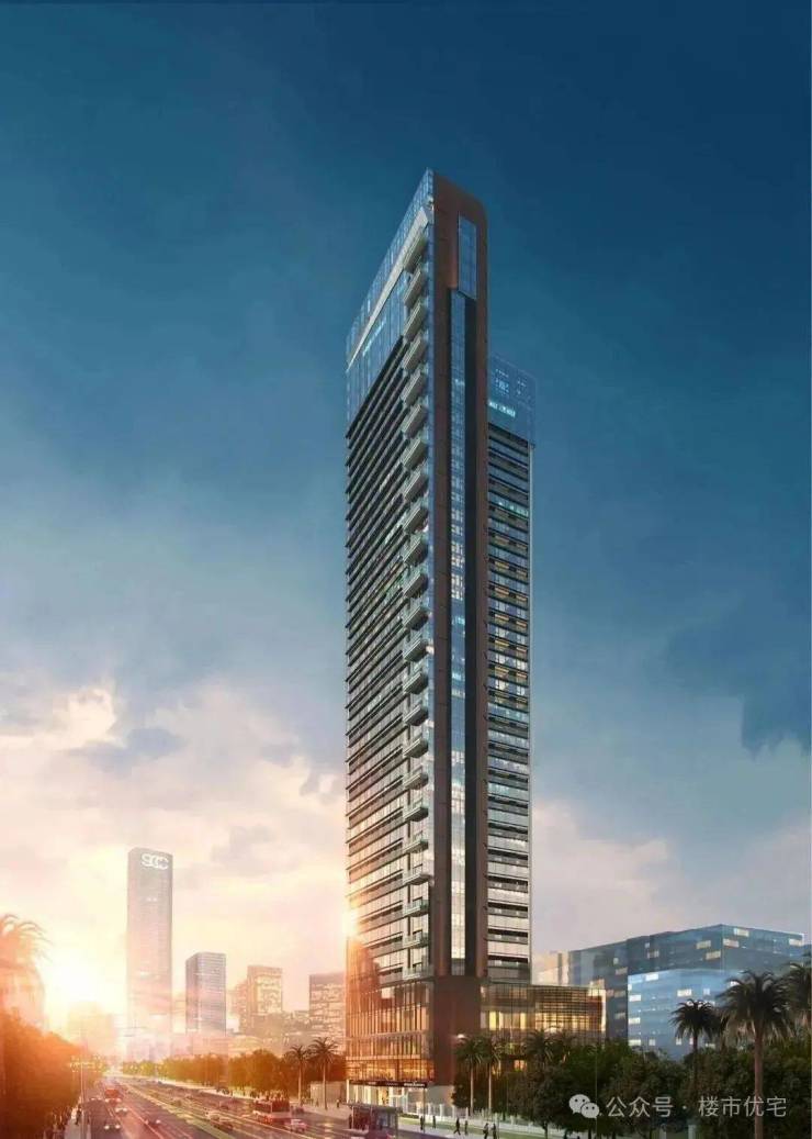 整栋建筑高 150 米,呈现 L 型布局,外立面是全玻璃幕墙设计,最大程度地保证了每一户的通风、采光与景观面,更是将山海城的景观视野做到了完美演绎。