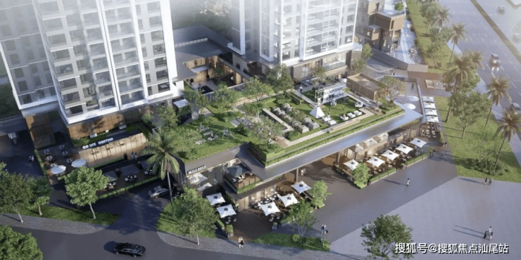 【抬高式檐上浮岛花园露台】:约1000㎡,位于商业街区顶层,业主私享花园露台,提供丰富空间活动区域,是邻里交流娱乐的理想场所。