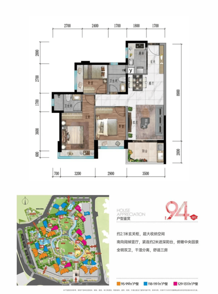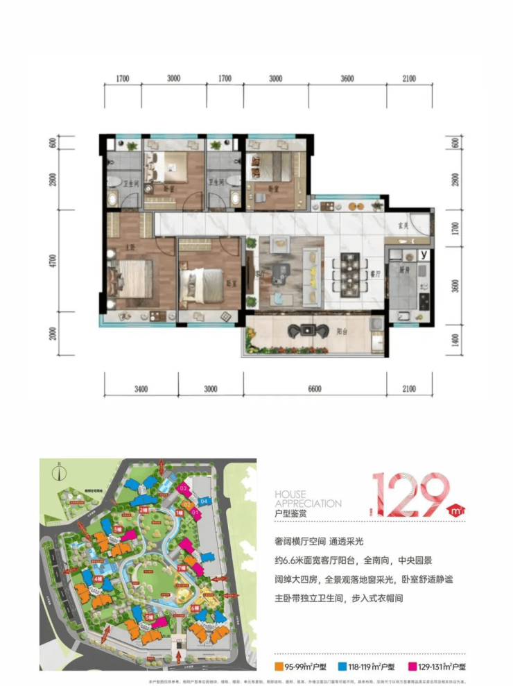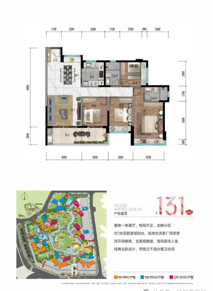3️⃣129㎡户型四房两厅两卫,稀缺园景横厅阔绰。