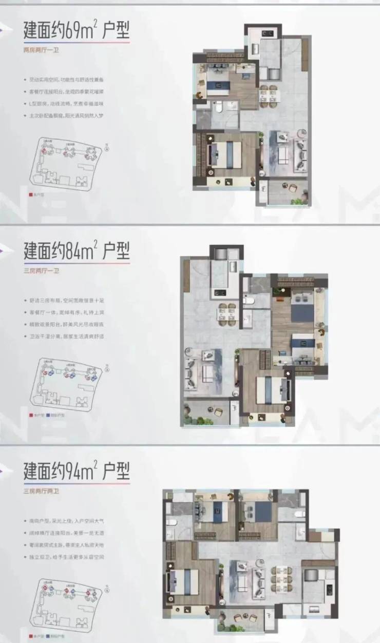 商品房建面:约69㎡2房2厅1卫、约84㎡3房2厅1卫、约94㎡3房2厅2卫