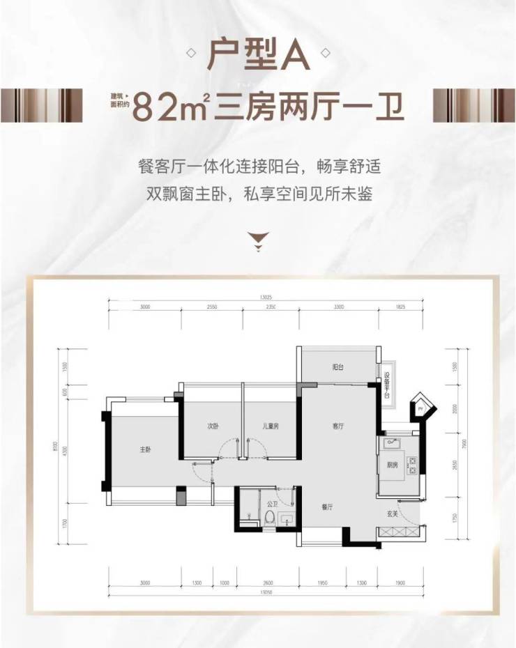 82㎡的3房2厅1卫(户型B),设计的是经典竖厅格局,进门入户玄关,客厅3.3米开间,LDKB一体化设计,动静分区,3个卧室分别做到了3.5米/2.7米/2.55米的宽度,主卧加1个次卧270°飘窗设计,U型厨房,得房率:77.5%(不含赠送),全部东北朝向。
