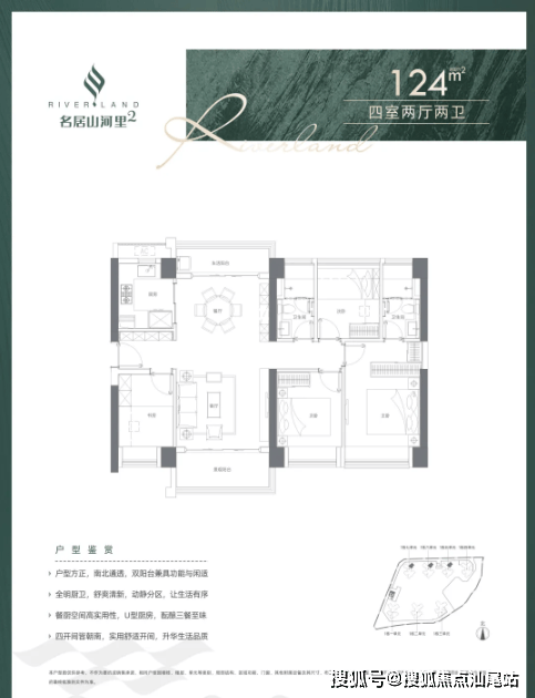 124㎡的4房2厅2卫,设计的是竖厅格局,客厅3.8米开间,南北通透双阳台,四开间朝南,全屋飘窗,U型厨房,得房率:73.86%(不含赠送),阳台1.5米进深,主朝东南向。