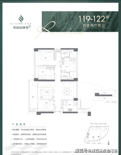 119-122㎡的4房2厅2卫,设计的是竖厅南北通透格局,客厅3.8米开间,四开间朝南,全屋飘窗,U型厨房,得房率:74.83%(不含赠送),阳台1.5米进深,6米长超大阳台,主朝西南向。