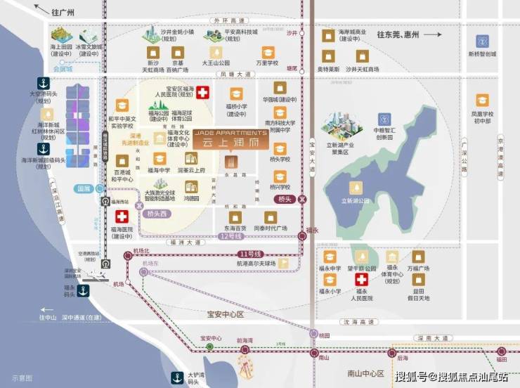 铁:穗惠深城际铁路(福海西站直线距离约1500米、深圳机场站),延线可直达福田中心区