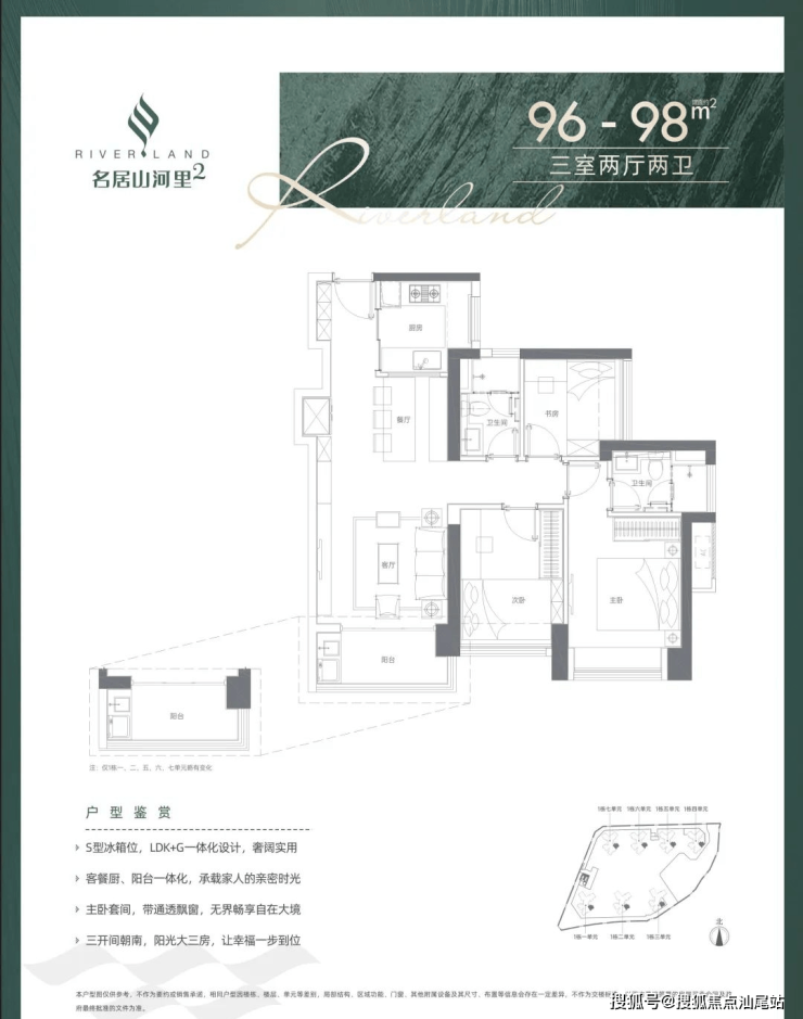 96-98平3房2厅2卫:东南朝向,不含赠送使用率在74%