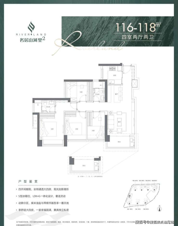 116-118平4房2厅2卫:东南朝向,不含赠送使用率在74%