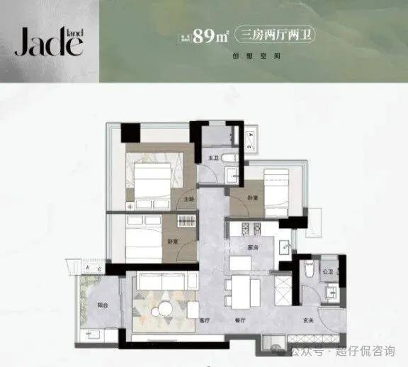 89㎡三房两卫:经典竖厅格局,三开间朝南,主卧+1个次卧270度飘窗,L型灵动式厨房,卫生间干湿分离,得房率约92%,西南或东南朝向。
