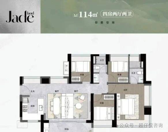 114㎡四房两卫:横厅南北通透格局,五开间朝南,全屋9面飘窗,主卧大套间,U型厨房,卫生间干湿式分离,得房率约92%,阳台主朝东南向。