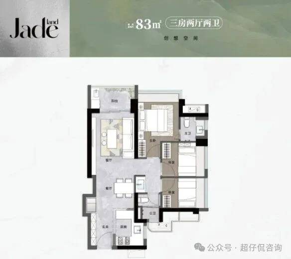 83㎡三房两卫:竖厅格局,进门入户玄关,LDKB一体化设计,S墙设计预留冰箱卡槽位,U型厨房,主卫少了淋浴,公卫三段式分离,得房率约92%,阳台西北朝向。