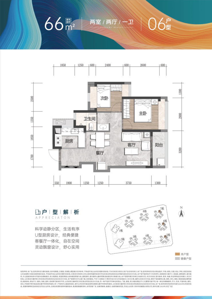 具体户建面约66㎡ 2房2厅1卫:南北通透,全凸窗设计,开放式U型厨房