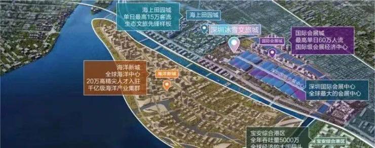 根据规划,海洋新城位于珠江口东岸,深圳大空港规划区西北部,毗邻全球第一大会展中心深圳国际会展中心,规划面积7.44平方公里。