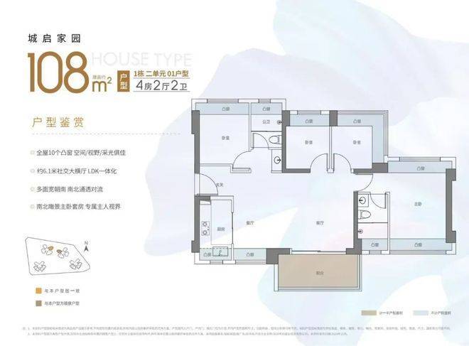 108㎡的4房2厅2卫,设计的是横厅南北通透格局,进门独立玄关,客餐厅6.4米开间,LDKB一体化,五开间朝南,主卧双飘窗通透设计,全屋10个凸窗,4个卧室分别做到了主卧17.01㎡/次卧9.7㎡/次卧8.4㎡/次卧7.35㎡(包含墙体飘窗),L型厨房,卫生间干湿分离,得房率约91.88%(包含赠送),阳台主朝西南或东南向。