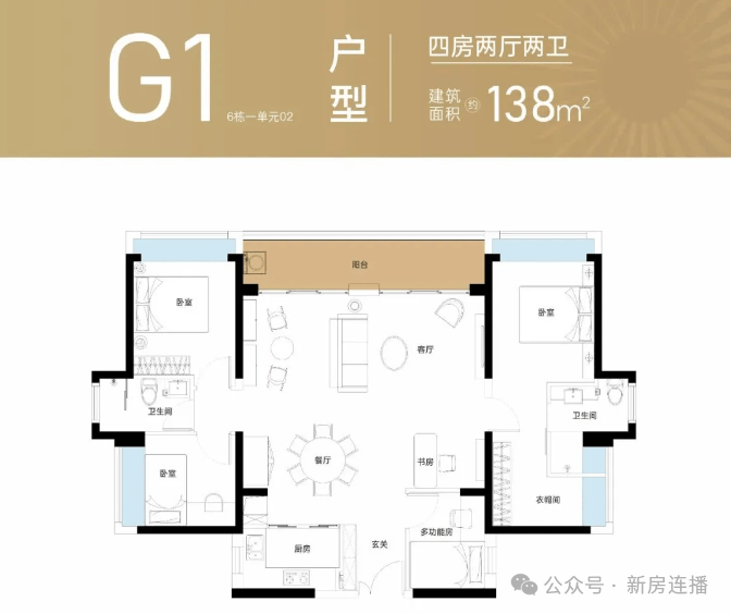 138平:4+1房2厅2卫,正东朝向,套内使用率73.52%(不包含赠送)
