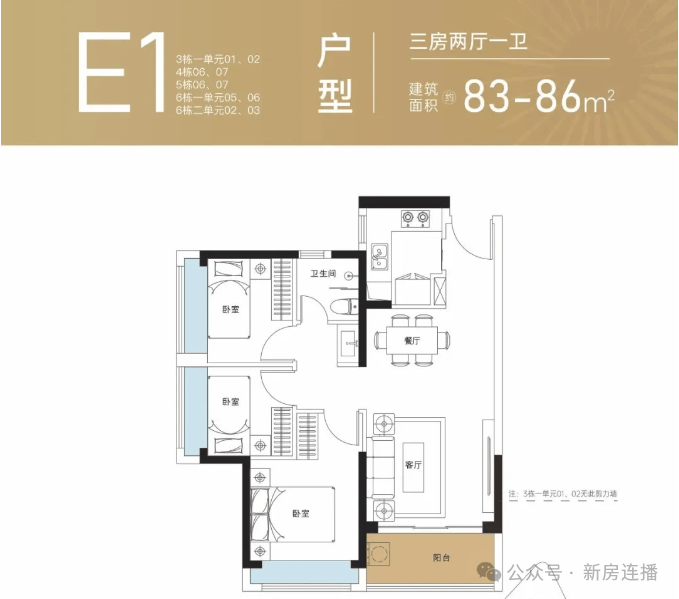 83平:3房2厅1卫,西南/东南/东北,套内使用率73.52%(不包含赠送)