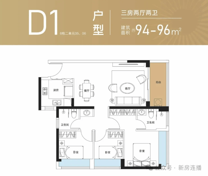 94平:3房2厅2卫,西南/东南/正西,套内使用率73.52%(不包含赠送)