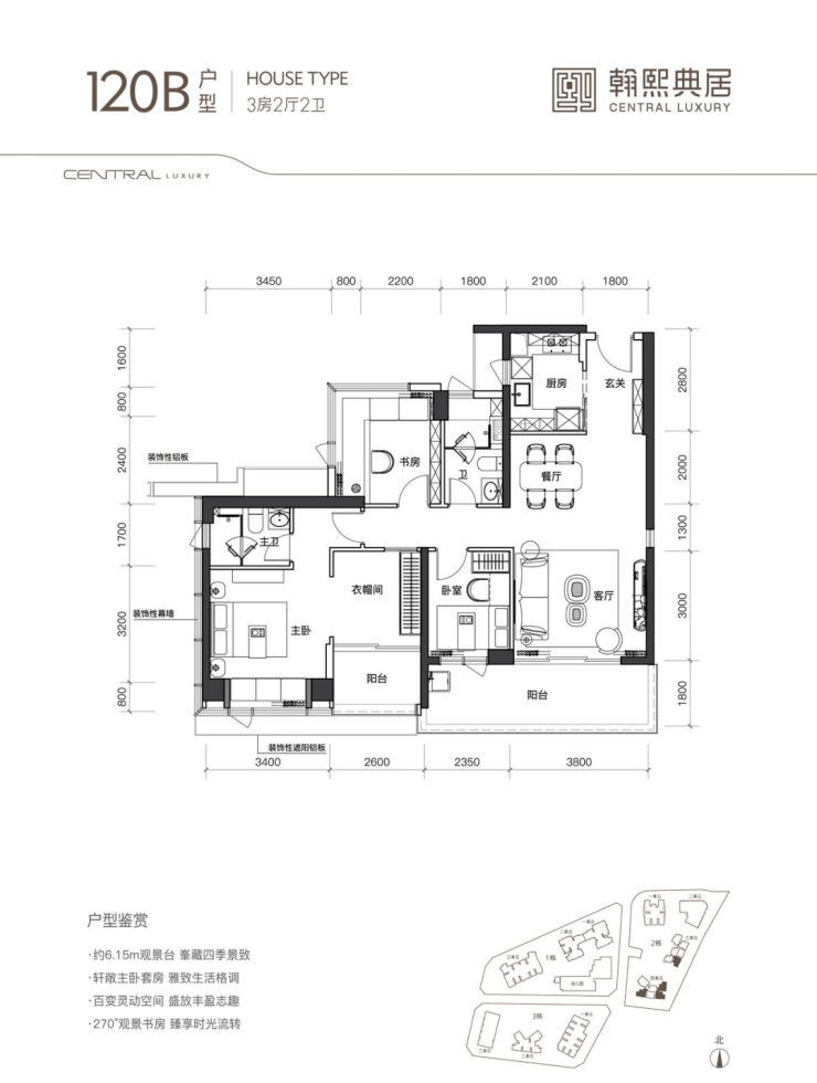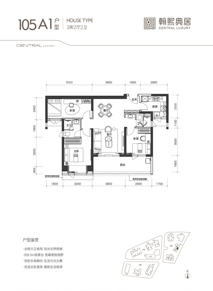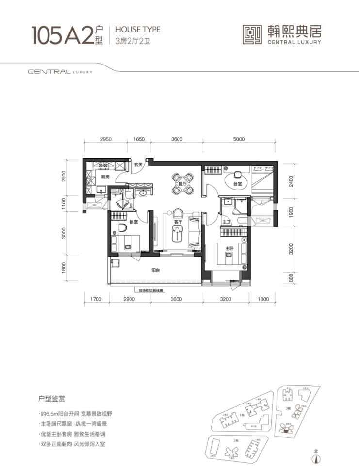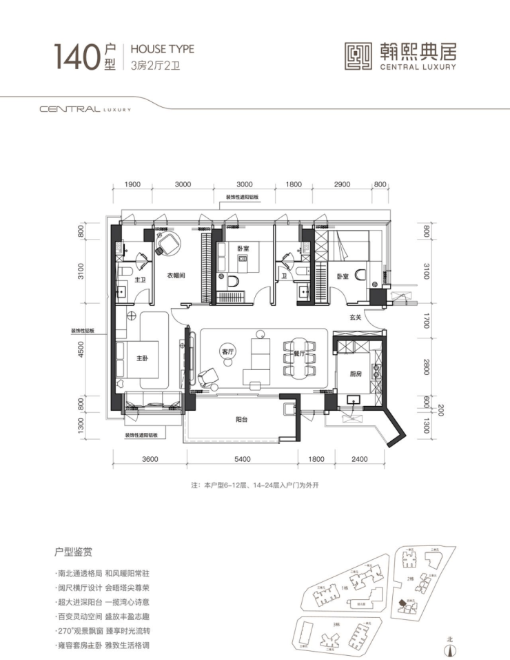 该户型为 02 地块的唯一一条腿,非常稀缺。户型南北通透,带大主卧套房的奢居型三房。带 5.4m 观景台,大横厅奢阔空间设计,主卧同客厅阳台、餐厅三面宽朝西南。北向双次卧、双卫生间、拓展空间共五面宽一字排开,视野全面俯瞰社区内园林,静谧舒适。