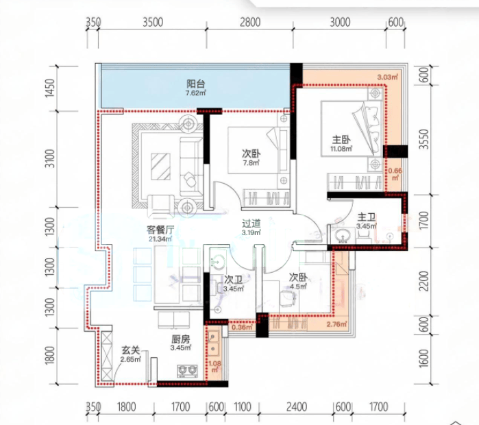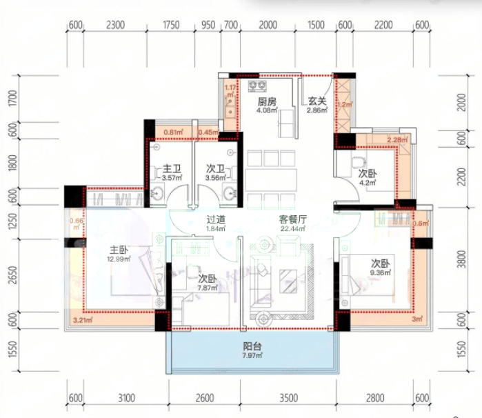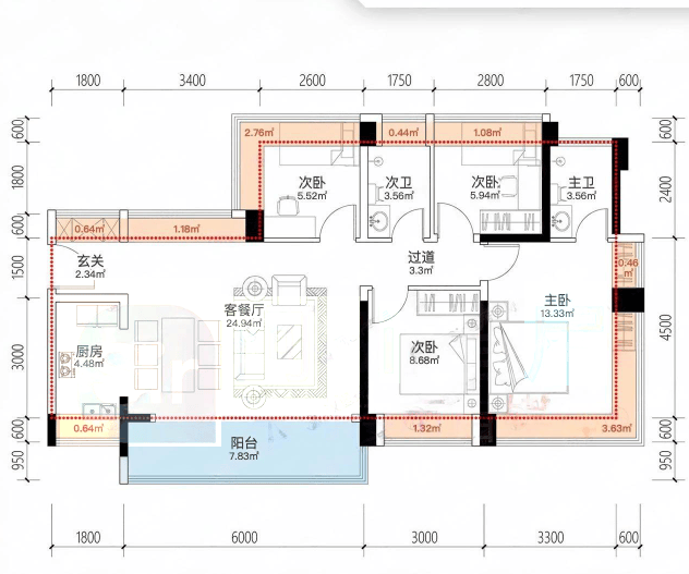 建面约95㎡3房2卫