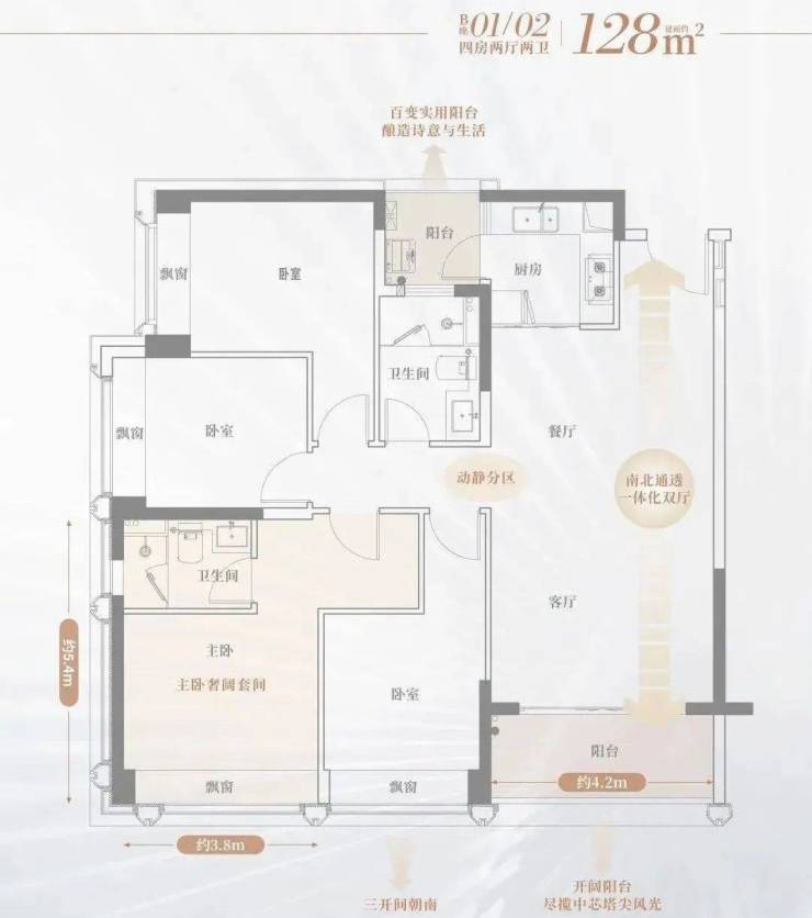 【128㎡户型图鉴赏】01/02户型:双卫浴、双阳台设计,独立分区从容优雅,主卧大套房,奢阔程度,主人私享舒适空间