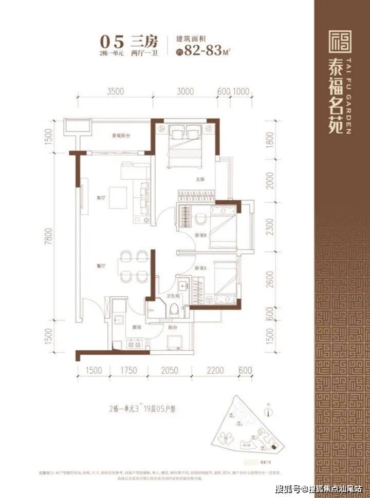 建面约82-83㎡的3房2厅1卫户型,在保证空间尺度感的前提下做到3个房间,实用性高