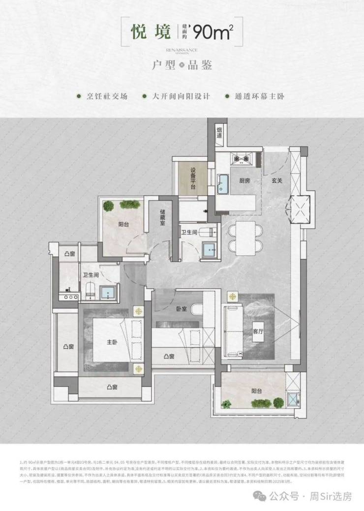 90㎡的3房2厅2卫,设计的是经典竖厅格局,进门入户玄关,LDKB一体化,S墙设计预留冰箱卡槽位,三开间朝南,U型厨房,卫生间干湿分离,还带1个设备平台,得房率约94.1-95.74%(包含赠送),西南朝向。