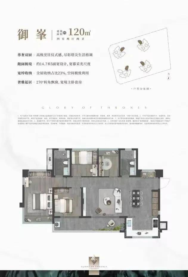 120㎡的4房2厅2卫,设计的是横厅南北通透格局,客餐厅开间8米,约14.7米超幕视野,超长阳台,主卧转角270°大飘窗,U型厨房,得房率:78.99%(不含赠送),阳台主朝西南或东南向。