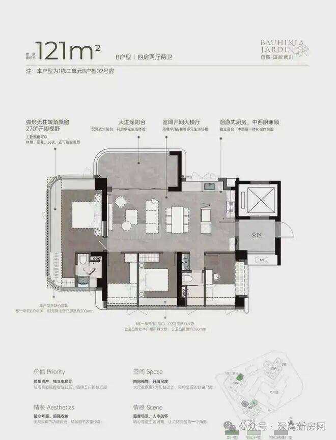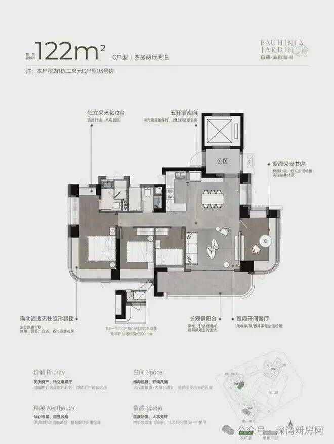 湾啟紫荆位于前海妈湾听海大道,占地约1.5万㎡,住宅建面约6.6万㎡,容积率5.14,共有三栋住宅组成,层高36-37F,共485户,车位595个,车位比1.1.2,4梯5户,主推约96㎡稀缺三房、111㎡3+1房、122㎡四房、142㎡四房。户型设计了大客厅、宽景阳台、阔景飘窗等,拥有山海河多重景观资源,计划品质精装交付。户型采用建筑新规设计,户户大阳台,4梯5户,分布式电梯设计,独立电梯厅。