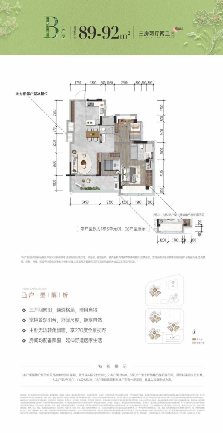首次推首北地块1栋3单元,约80-92㎡ 3房,共195套,新规使用率高达96%-105%!