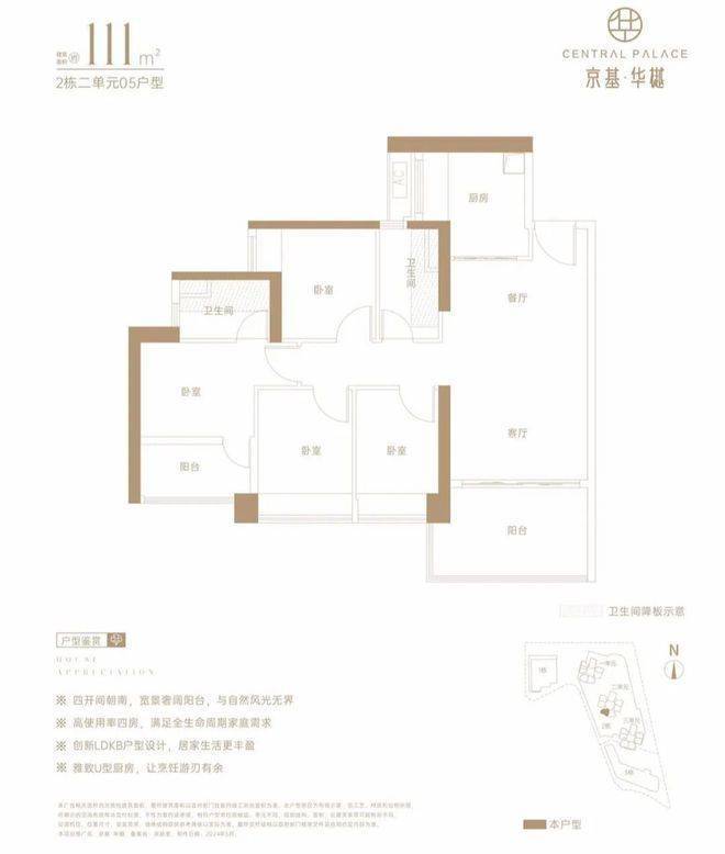 仅2栋2单元05户型才有,设计的是经典竖厅格局,LDKB一体化,动静分区,四开间朝南,U型厨房,卫生间干湿分离,得房率约73%(不含赠送),阳台西南朝向。