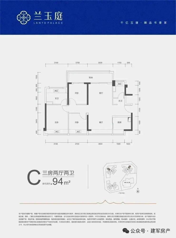 94㎡的3房2厅2卫,C户型,设计的是竖厅南北通透格局,客厅开间3.5米,3个卧室分别做到了3.1米/2.7米/2.7米的宽度,客厅连接次卧出6.2米长的大阳台,U型厨房,公卫三段式分离,得房率约79%(不含赠送),阳台主朝西北或东北向。
