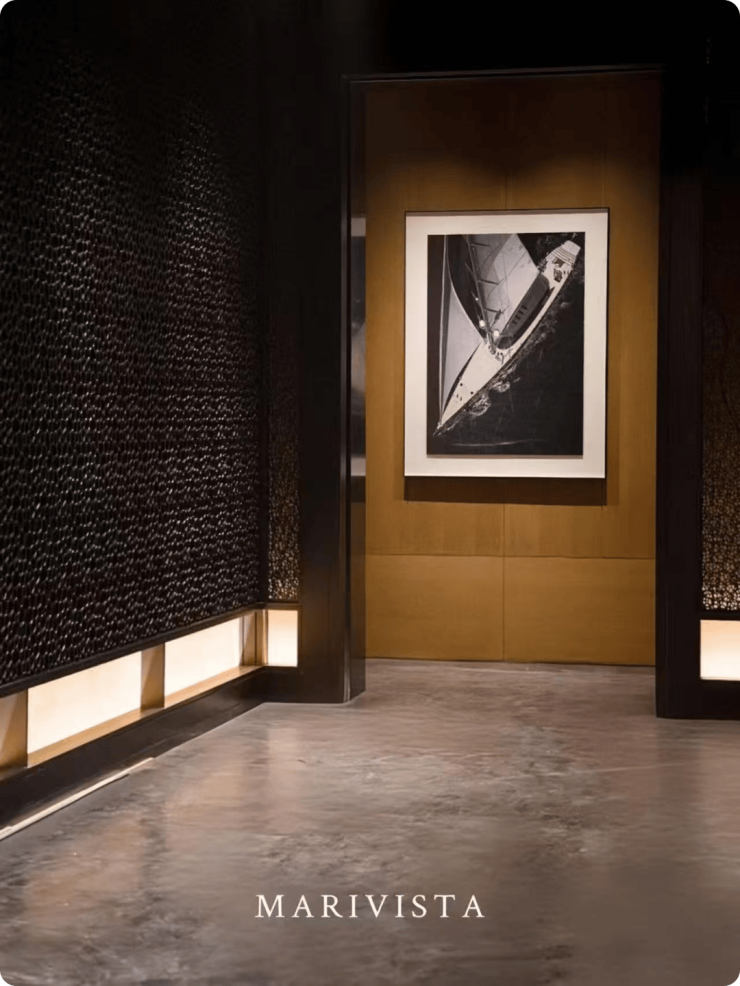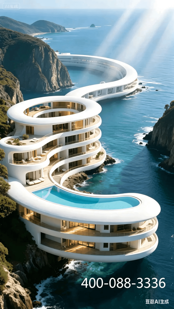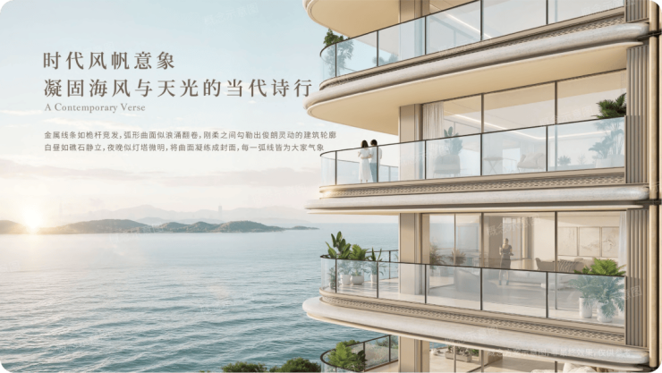 豪宅立面:项目采用大面积玻璃幕墙+金属线条组合立面,既符合现代化审美、豪宅配置,也能有效规避因临海带来的潮气与盐蚀,阳台采用无柱化环幕玻璃围栏,最大程度发挥项目临海观景优势。