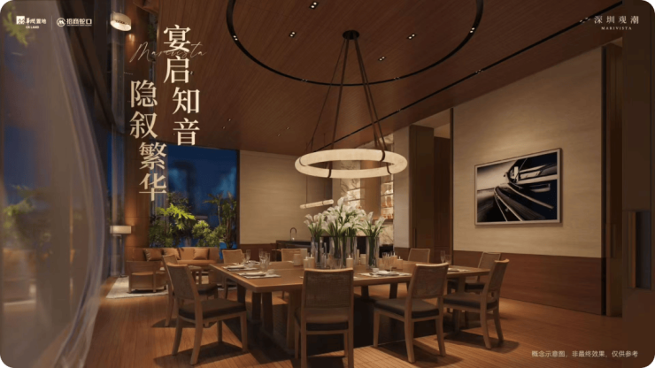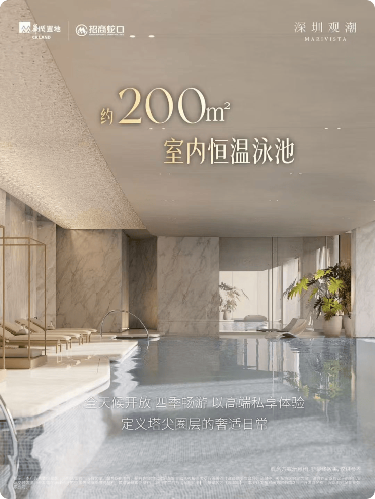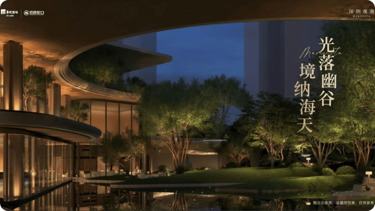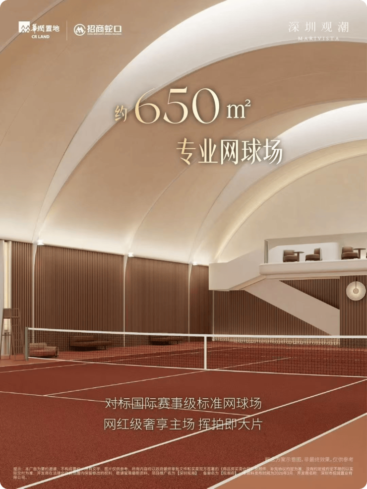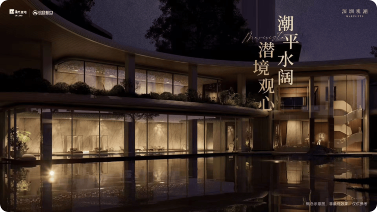 『深圳·观潮府』由11座23-26层住宅+商业/配套裙房组成,规划616户,配1205辆车位,配置三层立体滨海园林、涵盖商务、洽谈、宴请、休憩、阅读、茶艺、学习、健身、逸趣等,服务全龄段、满足全社交场景的业主私享高奢会所。