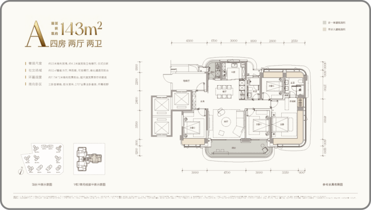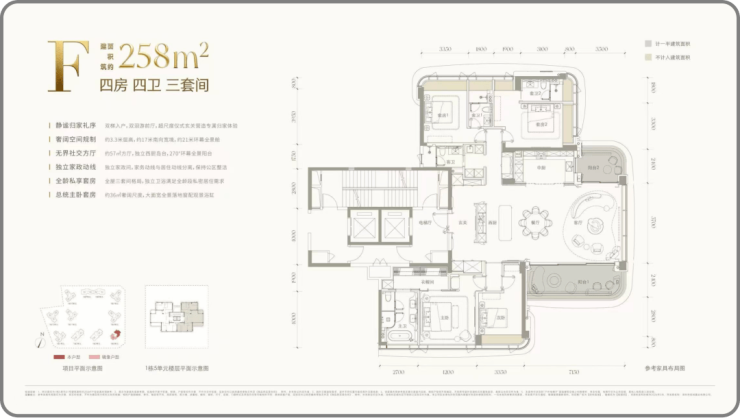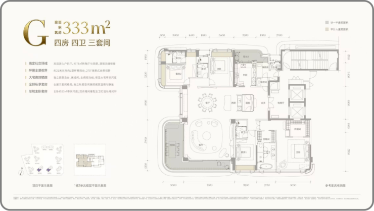 首推1栋3-5-6-7单元,220套,建面约143-168-188-258-260-333m²大平层四房;另有2套503-536m²顶楼大平层。