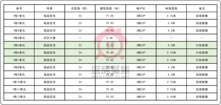 『深圳·观潮』座号有12个单元,但4单元是社区门楼,其它11座是住宅,总高23-26层,楼高77-80米,2梯2户的标准层高是3.3米,3梯3户的标准层高是3.15米。