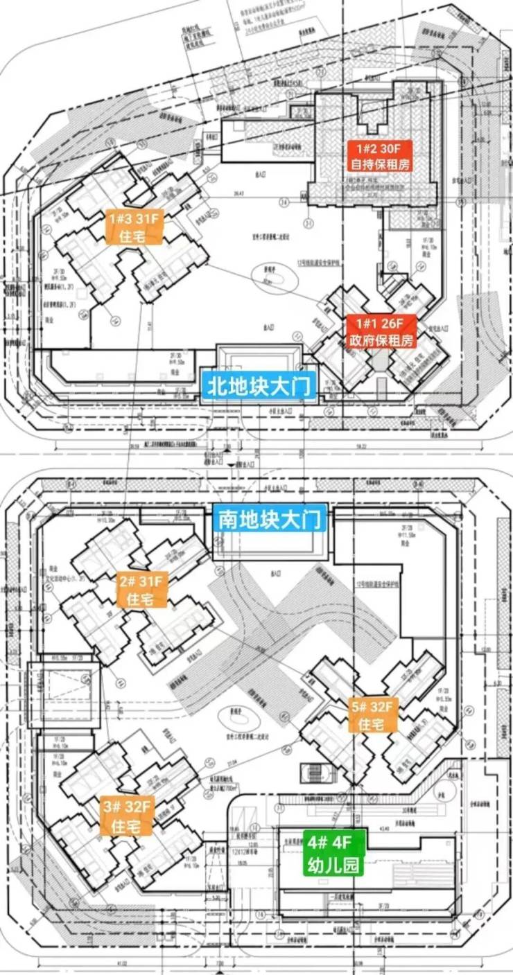 2、3、5栋为纯住宅,总高31-32层,4栋为1所4层2970㎡幼儿园,容积率4.3。