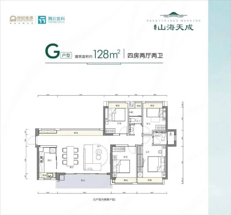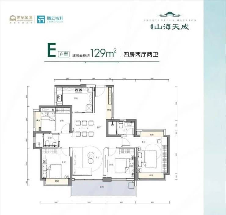 129㎡的4房2厅2卫,设计的是竖厅双龙抱珠格局,客厅3.8米开间,四开间朝南,4个卧室分别是3.6米/3.2米/3米/2.7米的宽度,U型厨房,